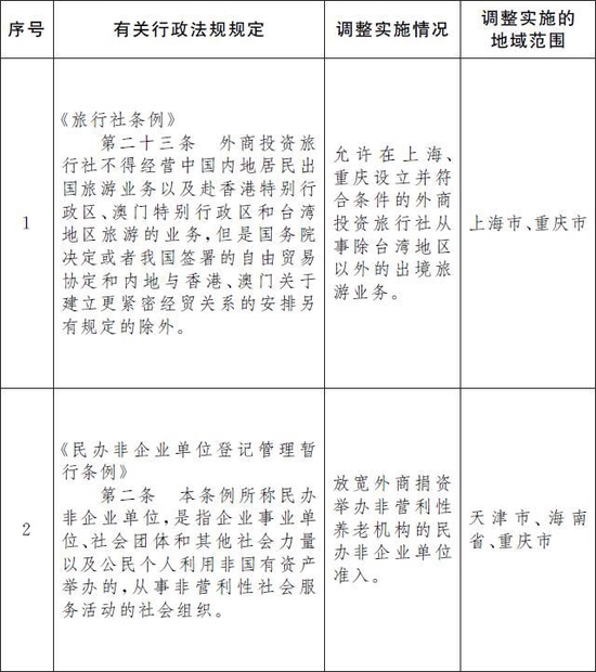 近日,国务院发布关于同意在天津、上海、海南、重庆暂时调整实施有关行政法规规定的批复,同意自即日起至2024年4月8日,允许在上海、重庆设立并符合条件的外商投资旅行社从事除台湾地区以外的出境旅游业务。批复全文如下: 国务院关于同意在天津、上海、海南、重庆暂时调整实施有关行政法规规定的批复 国函〔2022〕104号 天津市、上海市、海南省、重庆市人民政府,商务部、司法部: 你们关于在天津市、上海市、海南省、重庆市暂时调整实施有关行政法规规定的请示收悉。现批复如下: 一、按照《国务院关于同意在天津、上海、海南、重庆开展服务业扩大开放综合试点的批复》(国函〔2021〕37号),同意自即日起至2024年4月8日,在相关省市暂时调整实施《旅行社条例》、《民办非企业单位登记管理暂行条例》的有关规定(目录附后)。 二、国务院有关部门、相关省市人民政府要根据上述调整,及时对本部门、本省市制定的规章和规范性文件作相应调整,建立与服务业扩大开放综合试点相适应的管理制度。 三、国务院将根据相关省市服务业扩大开放综合试点情况,适时对本批复的内容进行调整。 附件:国务院决定在天津、上海、海南、重庆暂时调整实施的有关行政法规规定目录 国务院 2022年9月21日 (此件公开发布) 附件 国务院决定在天津、上海、海南、重庆 暂时调整实施的有关行政法规规定目录